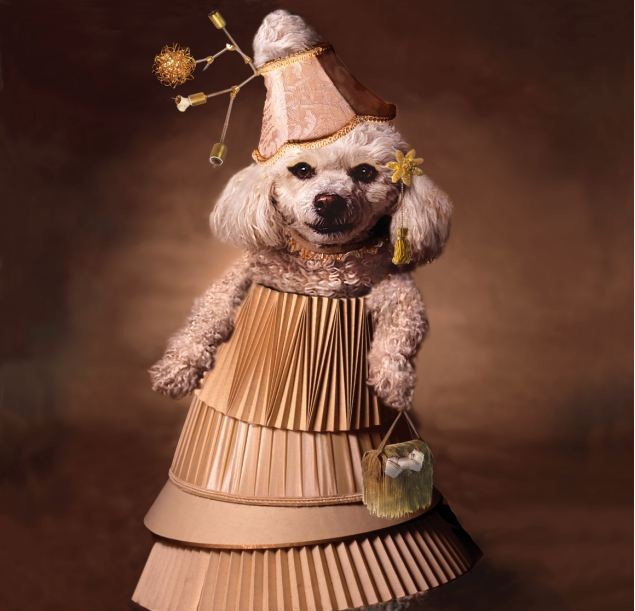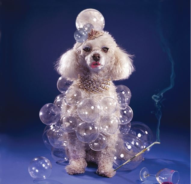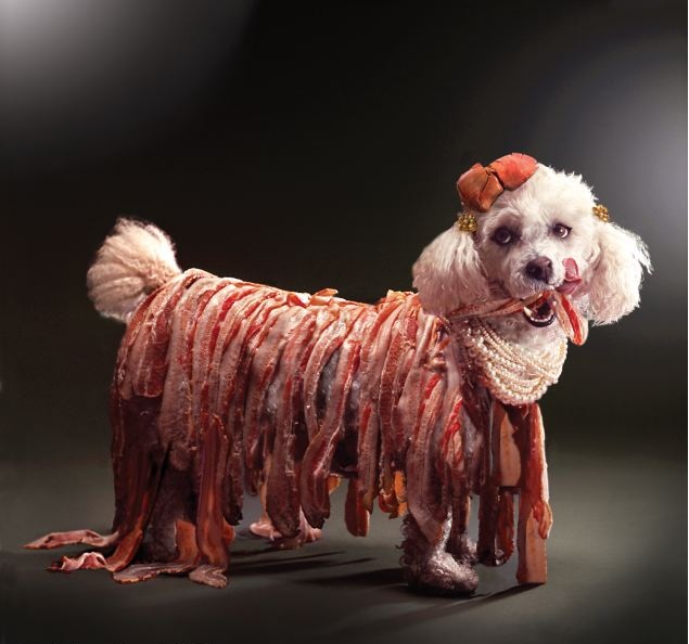 Έτσι, ο σκυλάκος φόρεσε φτερά, πούπουλα, κραγιόν, στρας και φυσικά το περίφημο φόρεμα από κρέας, το οποίο εν προκειμένω ήταν μπέικον και είναι απορίας άξιο πώς δεν το καταβρόχθισε την ώρα της φωτογράφισης.